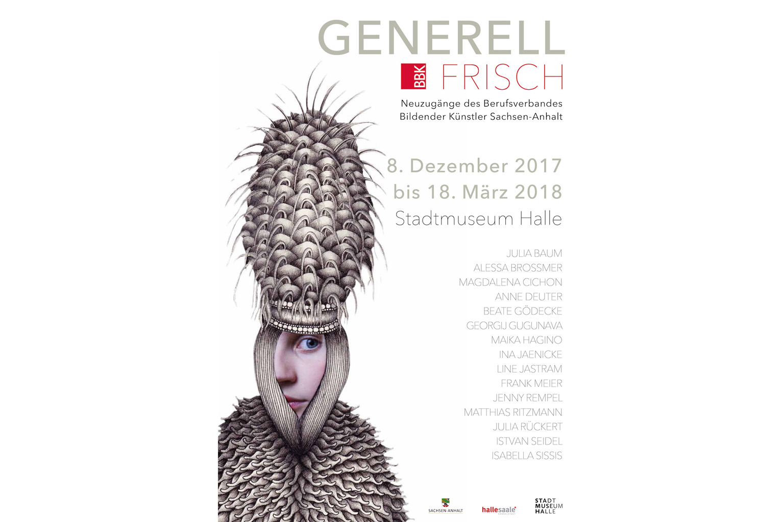 Zur vierten Ausgabe von GENERELL FRISCH präsentieren fünfzehn im vergangenen Jahr neu in den BBK aufgenommene Künstler ihre Arbeiten im Stadtmuseum Halle. Malerei und Zeichnung sind ebenso vertreten wie Fotografie, klassische Plastik und experimentellere Positionen – etwas Hybride aus Skulptur und Schmuck, Buchobjekte oder opulente Schaukästen aus Papier und Metallfolie, die an indonesisches Schattentheater erinnern.